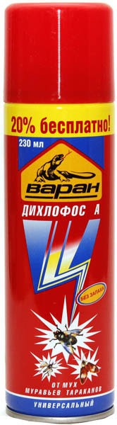 Дихловос «Варан» — универсальное средство для уничтожения ползающих и летающих насекомых без запаха. Инсектицид от летающих насекомых. Объём флакона — 230 мл. Сделано в России.