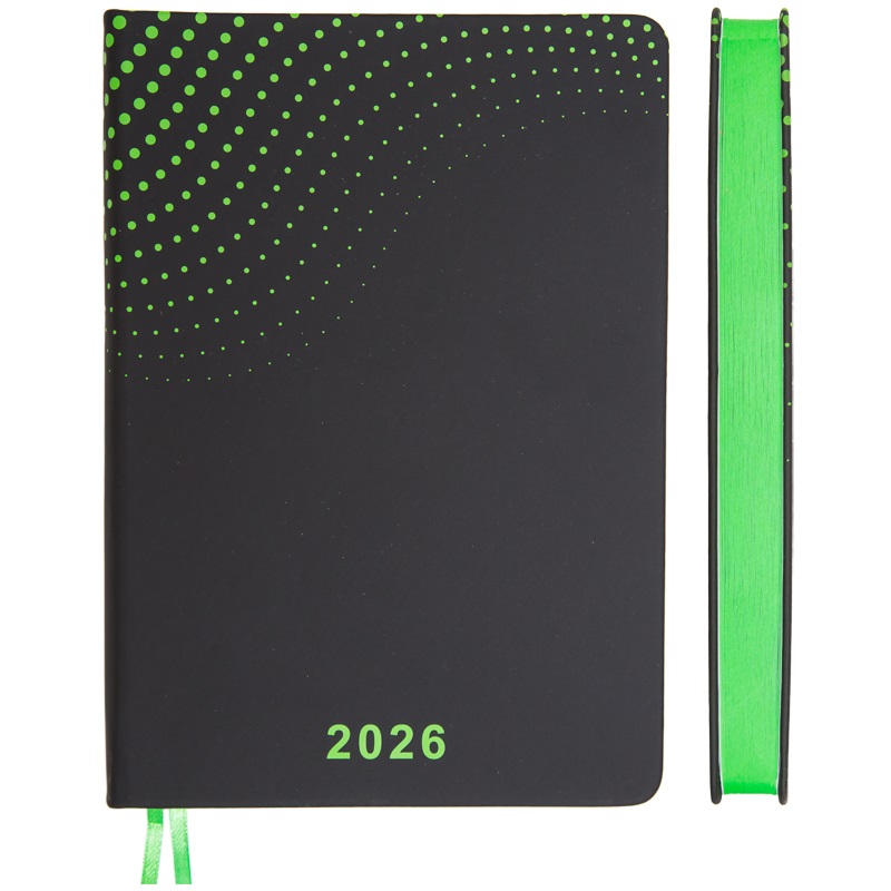 Ежедневник датированный 2026 "deVENTE. Duo" A5 (145 ммx205 мм) 336 стр, белая бумага 70 г/м² с салатовым срезом, печать в 2 краски, твердая обложка из искусственной кожи, шелкография, перфорация, закругленные уголки, 2 ляссе, в термоусадочной пленке, черный с салатовым
