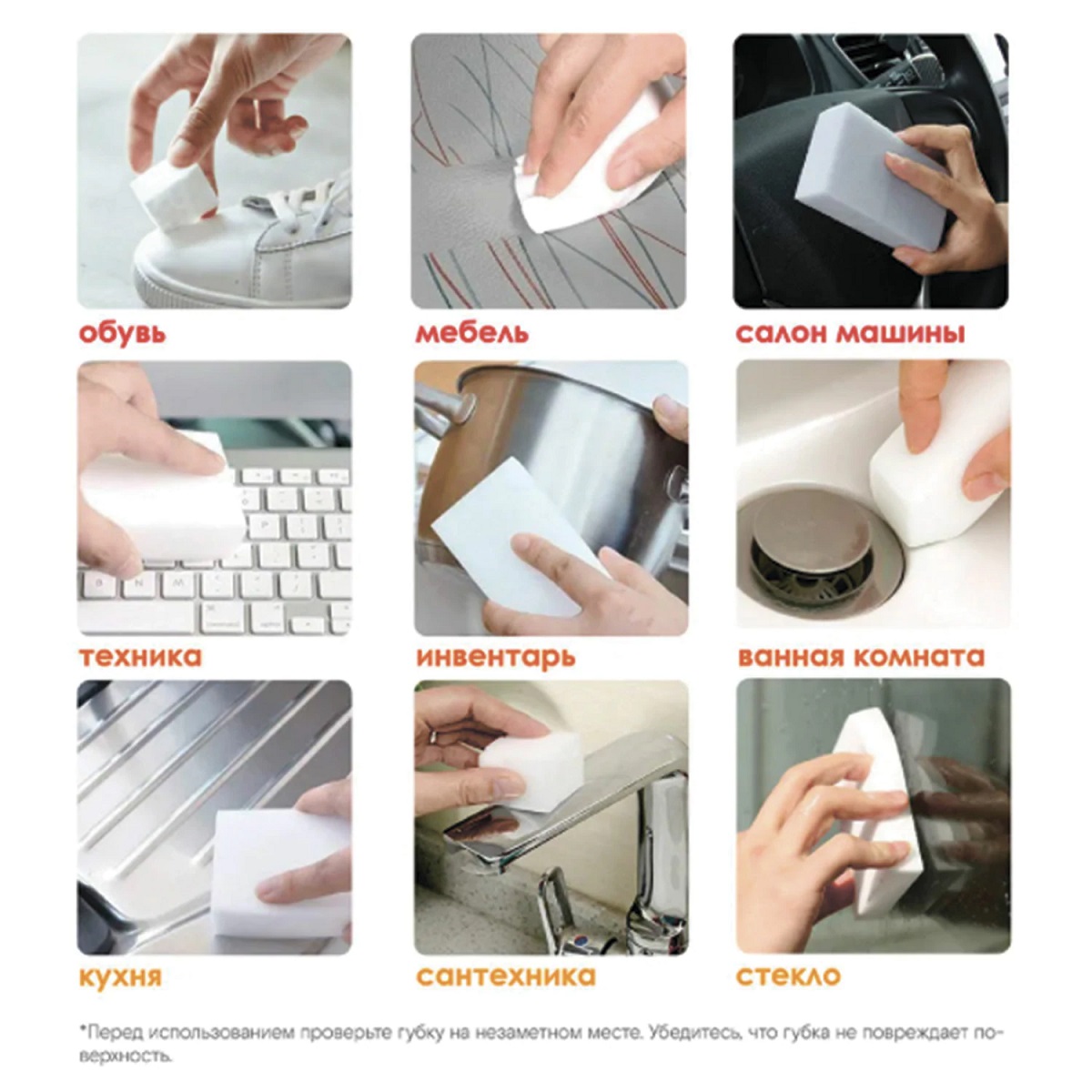 Губка-ластик удаляет стойкие загрязнения, следы перманентного маркера с твердых поверхностей, жирный налет, доводит до блеска закопченные поверхности кастрюль. Убирает мыльный налет в ванной, некоторые пятна с одежды. P.S: СМОЧИТЬ ПЕРЕД ПРИМЕНЕНИЕМ.