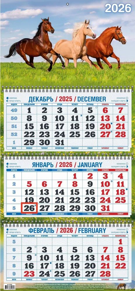 Календарь квартальный на 2026 год, 3 блока 3 гребня с курсором, 310*680мм. Тройка лошадей