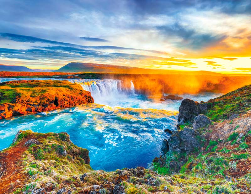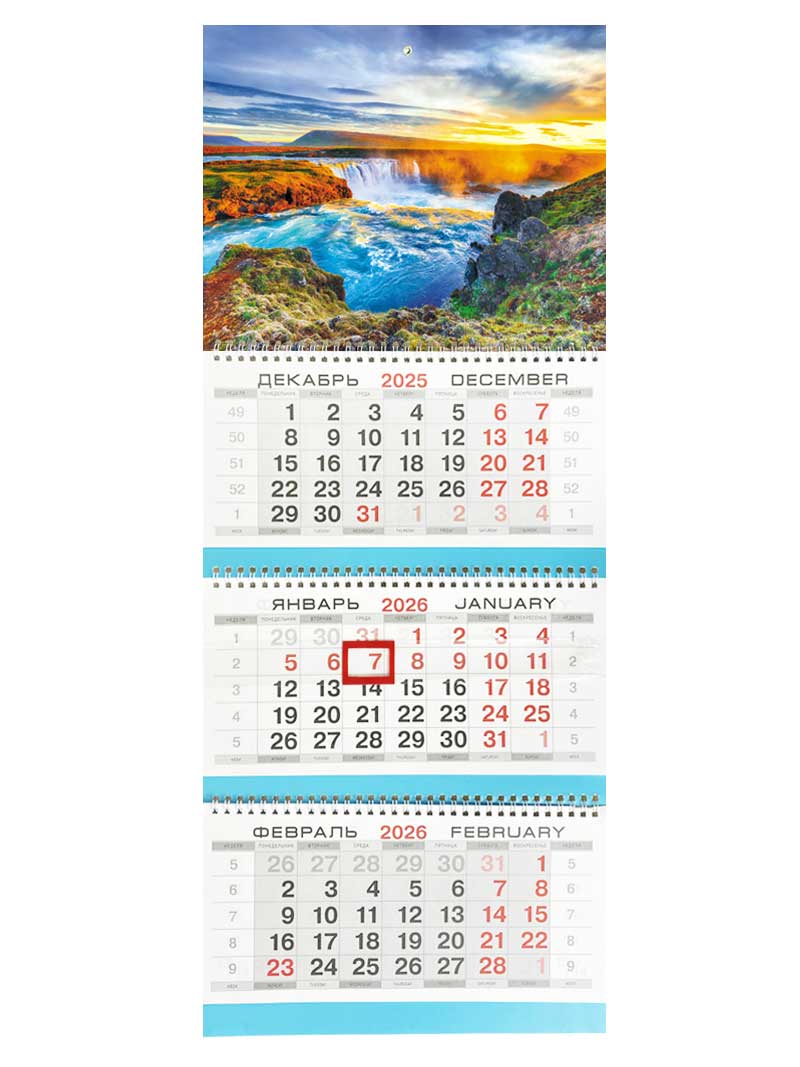 Календарь квартальный на 2026 год, 3 блока 3 гребня с курсором, металл+объем 295*720мм. Рассвет над водопадом