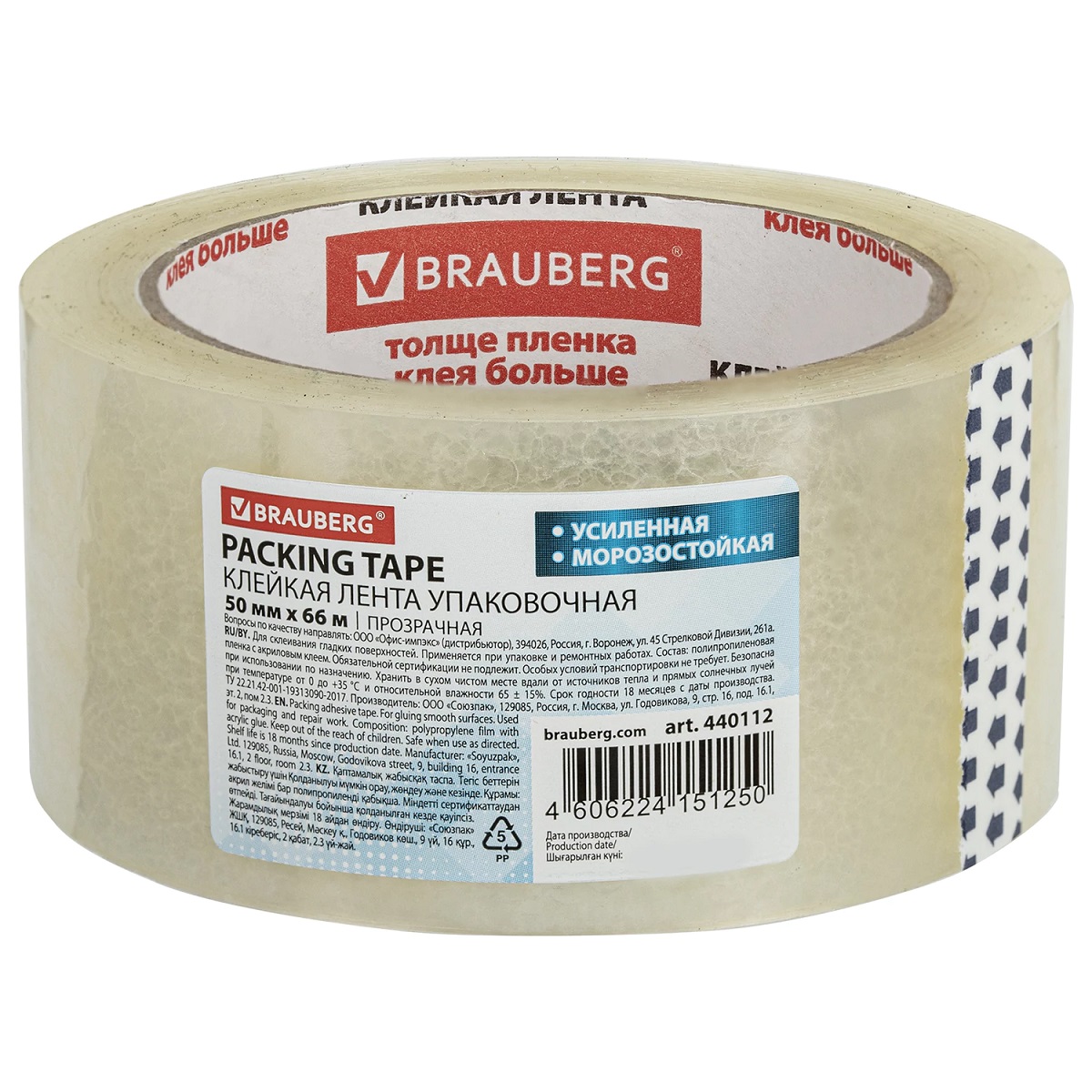 Клейкая лента упаковочная 50 мм х 66 м, прозрачная, УСИЛЕННАЯ, МОРОЗОСТОЙКАЯ, толщина 50 микрон, BRAUBERG
