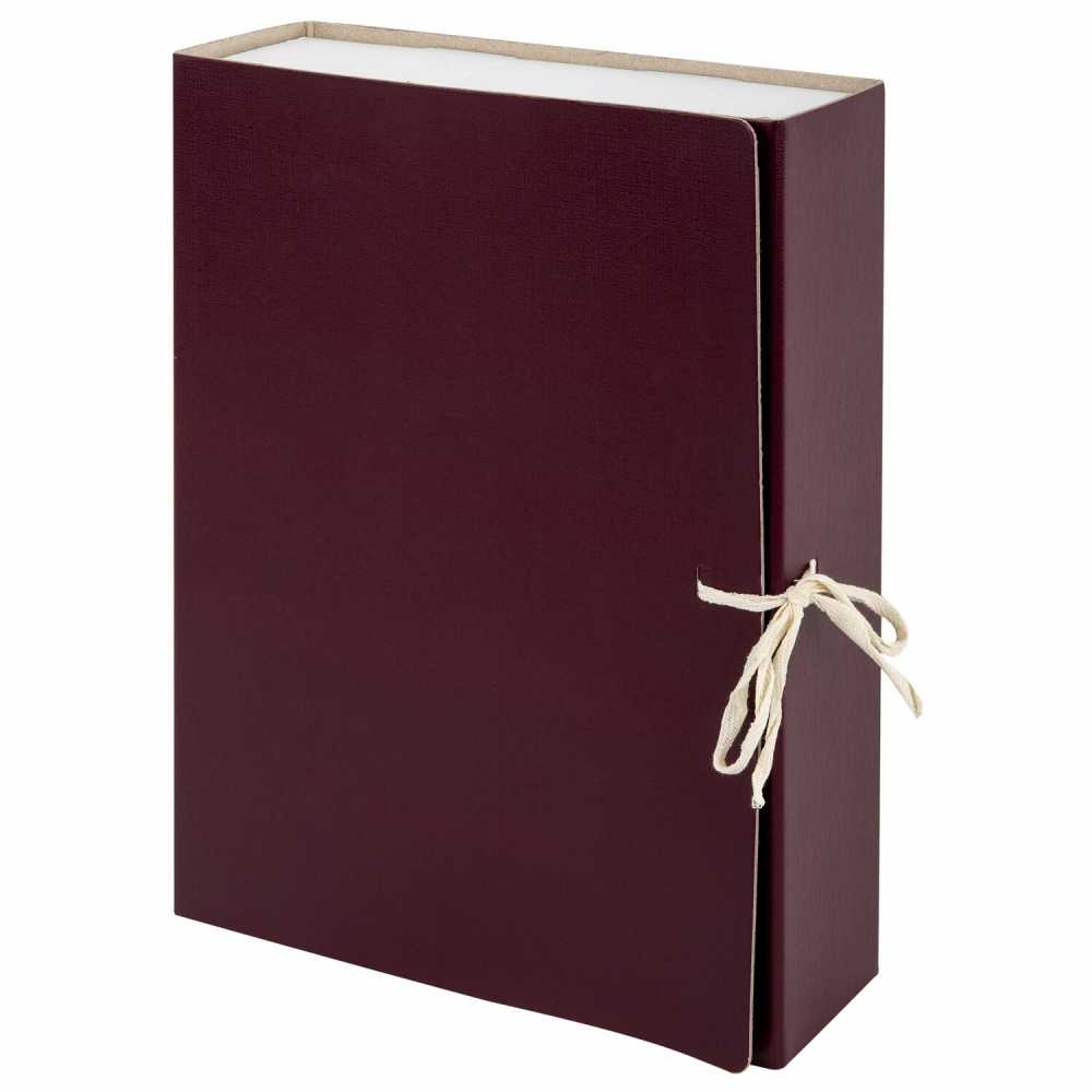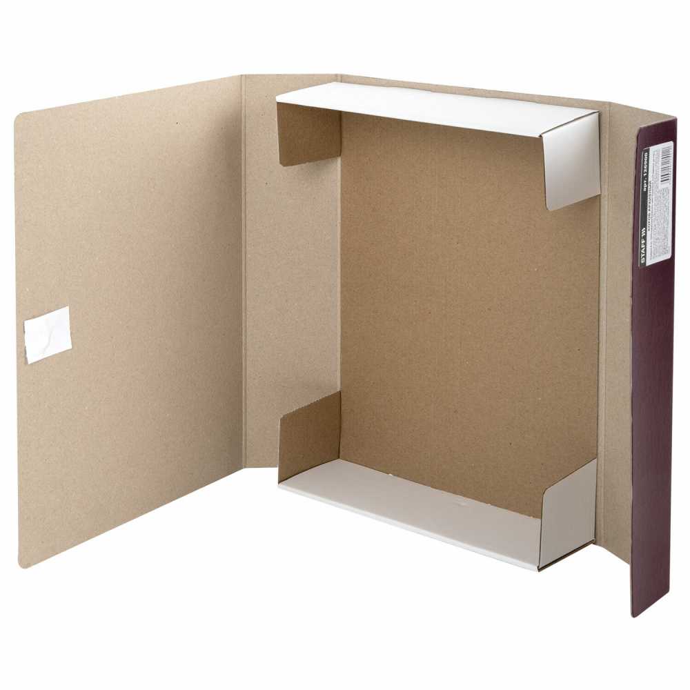 Изготовлен из переплетного картона толщиной 1,5 мм с покрытием бумвинил. Вмещает до 700 листов. Выдерживает до 4 кг. Размер короба - 33x8x24 см. Имеет откидную крышку и 2 хлопчатобумажные завязки. Поставляется в разобранном виде.