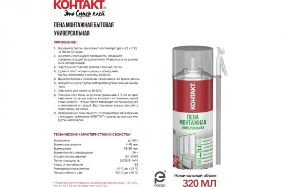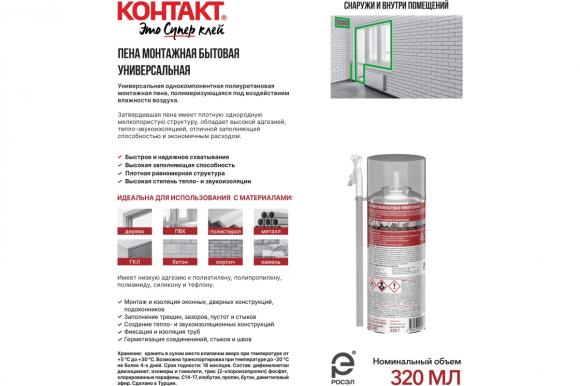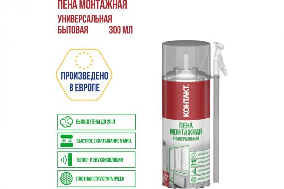 Пена монтажная КОНТАКТ универсальная однокомпонентная полиуретановая, полимеризующаяся под воздействием влажности воздуха. Затвердевшая пена имеет плотную однородную мелкопористую структуру, обладает высокой адгезией, тепло- и звукоизоляцией, отличной заполняющей способностью и экономичным расходом. Бытовая монтажная пена наносится при помощи специальной трубки - адаптер, входит в комплект.