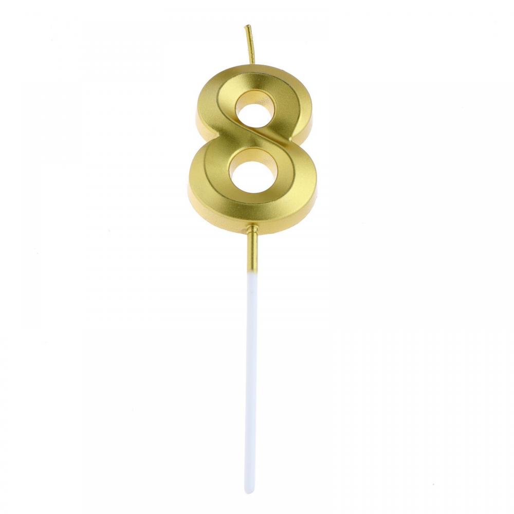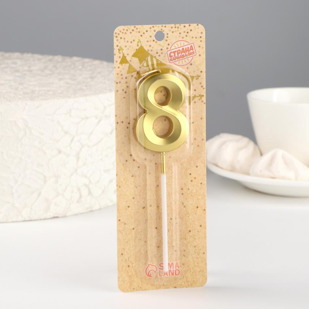 Золотая свеча-цифра «8» на шпажке из серии «Грань» — это стильный и яркий элемент декора для вашего праздничного торта.